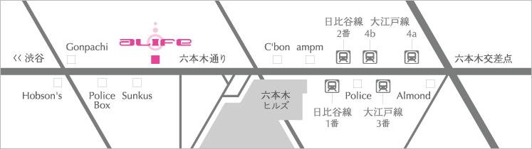(日比谷線六本木駅2番出口より徒歩5分 / 大江戸線六本木駅4b出口より徒歩7分)